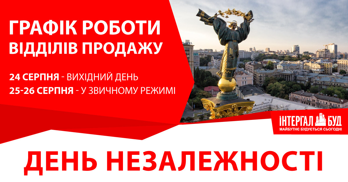 Компанія «Інтергал-Буд» повідомляє, що 24 серпня до Дня Незалежності у всіх відділах продажу вихідний.
